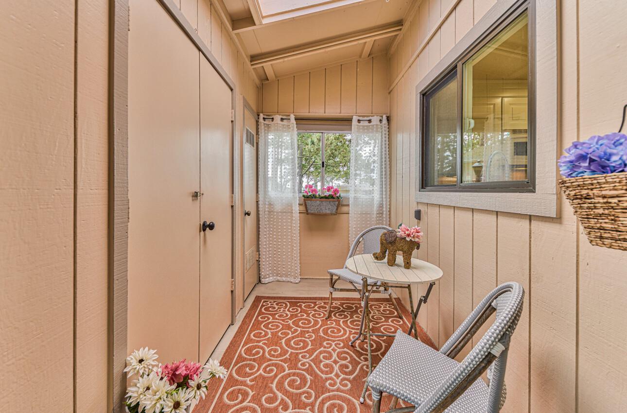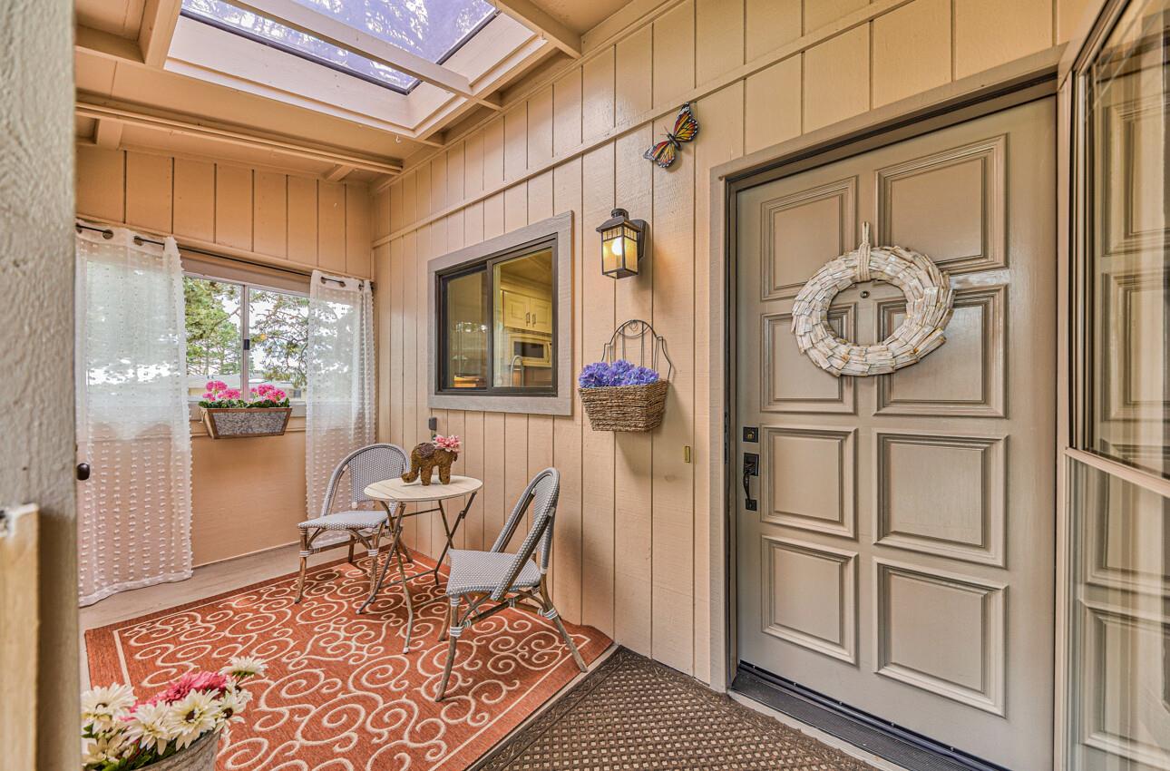 Nestled in a serene forest setting, this bright and updated upstairs end unit offers a peaceful coastal escape. Once inside, you'll enjoy single level living, featuring a cozy fireplace, and a large primary bedroom with dual closets and a wall-to-wall sliding glass door leading to a long deck - your new afternoon spot to enjoy the sunset skies, filtered peeks of the water, and forest views. Modern coastal lighting fixtures illuminate the tastefully updated space, including granite countertops, laminate flooring throughout the main areas, new carpet in the bedrooms, and stylish ballisters on the deck. The split bathroom was thoughtfully designed with the shower/toilet in a separate room. The front porch is partially enclosed bonus space - perfect for enjoying your morning coffee by the window. Conveniently located with easy access to Highway 1 and Holman Highway, this community offers both nature and city amenities close by. Embrace the tranquility of coastal living in this inviting retreat, where the beauty of the surroundings harmonizes with modern comforts.